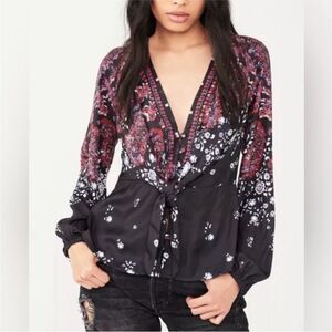 Free People Black and Pink Tie Front Blouse