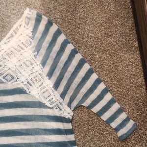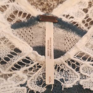 This relaxed Free People blouse features an asymmetrical design in white and blue, offering a chic and comfortable fit. The 3/4 sleeves and subtle lace accents add a touch of elegance to this versatile top, perfect for any casual outing.
