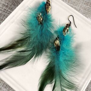 These exquisite earrings from Free People showcase vibrant blue feathers paired with elegant gold accents, creating a captivating bohemian look. The feathers cascade beautifully, adding movement and a touch of whimsy to any ensemble. Perfect for those who appreciate unique and stylish jewelry.