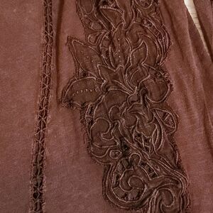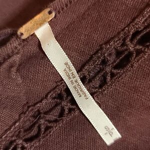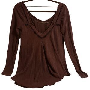 Free People Top, burgundy with lace cut outs on front sides, vneck long sleeve. Back is pleated and longer length with strap between shoulders.