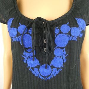 Machine washable cotton. Black with shadow stripes and blue floral embroidery. Cap sleeves, some raw hems and ties at the neck with a few buttons as well. Size 2. Can also be worn as a mini dress!