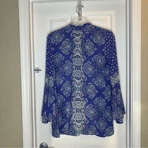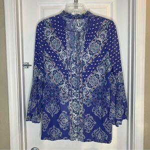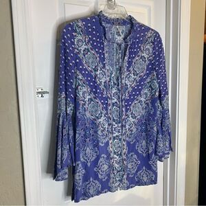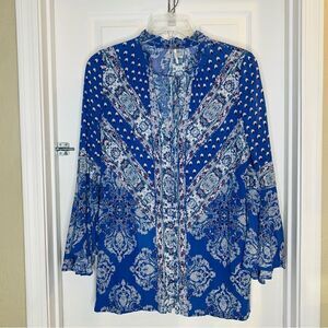 Free People - Cornflower Blue Bohemian Print Bell Sleeve Shift Dress Sz Small