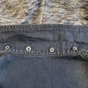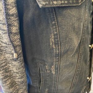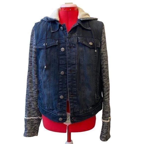 Free People Distressed Denim Jacket, Size M, Front Button Closure, Four Front Pockets, Sweatshirt Hoodie and Sleeves, Removable Hoodie, 100% Cotton, Machine Washable, Approximate Measurements: Chest 19”, Waist 18”, Sleeves 26”, Shoulder to Hem 21”. In some of the pictures the garment looks blue but this garment is black and gray.