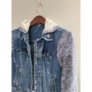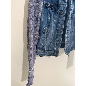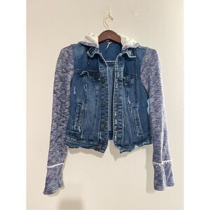 Free People Distressed Denim Jacket with Knit Sleeves & Hood Women's Size Small