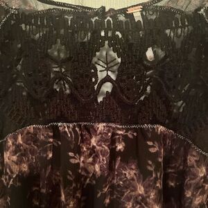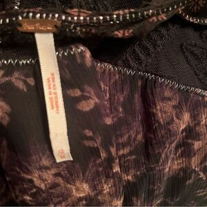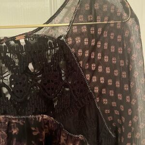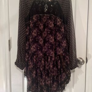 Chic long sleeve dress with floral design. Sheer sleeves and layered skirt. Ideal for fashionable events.
