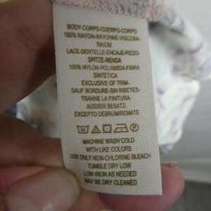 Machine washable rayon with nylon lace. Features swing silhouette, skirted bottom, small chest pocket, delicate lace and faux peter pan collar, buttons partially down the back, and lightweight material. Size small.