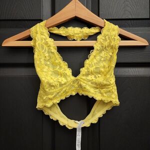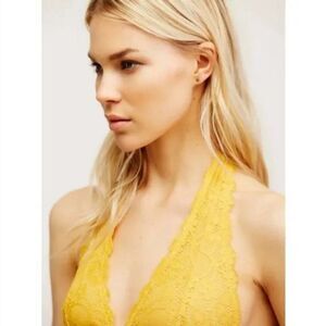 Stretchy and soft lace halter bralette with a plunging neckline, mesh lining and scalloped trim. Gives good support even without an underwire. Slip-on halter neck with a double hook-and-eye closure in back.