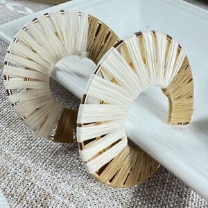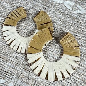 Stylish hoop earrings. Features gold and cream woven design. Perfect for any occasion.