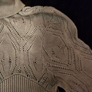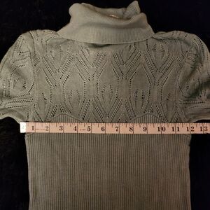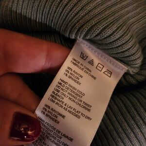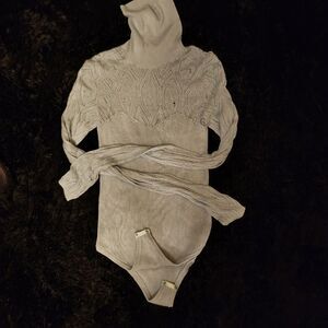 This fitted bodysuit from Free People features a stylish ribbed texture and a classic turtleneck collar, offering a sleek and modern look. The vibrant green color adds a pop of freshness to your wardrobe, making it a versatile piece for any occasion. Its bodysuit design ensures a seamless fit, perfect for layering or wearing on its own. I dont know the size. It measures pit to pit 12 inches but is very stretchy, so I think it could fit a lot of sizes!
