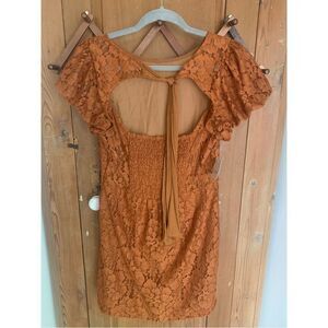 Free People rust colored lace mini dress with puff short sleeves and jewel neckline. Has open back with elastic panel and back tie closure. Fully lined with side zipper closure. NWT