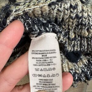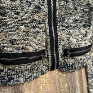 Good gently used condition, no major flaws or signs of wear. Smoke and pet free home. Size XS. Pretty knit weave, colors are browns, black, greens, neutrals. Cotton, Rayon, Nylon materials. Not itchy, its soft. Zip pockets are short but functional. Great for casual wear, true to size. Has some stretch.