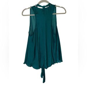 Elegant teal sleeveless blouse with unique tie detail. Perfect for a chic look.