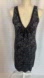 FP Free People black and gray vintage jacquard print sweater-like knit fitted bodycon mini tank dress with beaded neckline. This dress has gorgeous dark beaded embellishments, V-neckline, pullover styling, sleeveless.