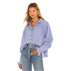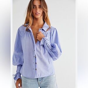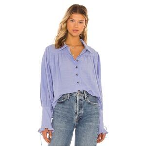 Free People Kiss Kiss blouse in lupine meadow color. cotton with button up closure. Juliette sleeves with ties at ruffled cuffs. Really good gently used condition. Size Small