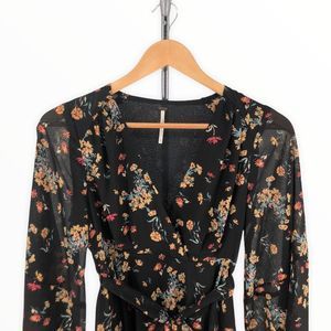 Free People Lilou Black Floral Print Mini Dress Belted Long Bell Sleeves