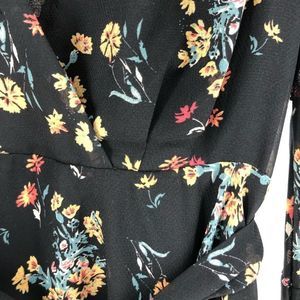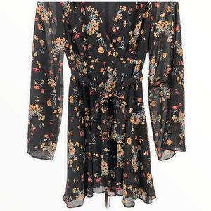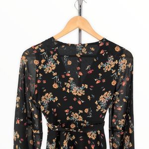 Black floral print mini dress with a self-tie belt, sheer long bell sleeves, hidden side zip closure, fully lined except sleeves, surplice v neckline.