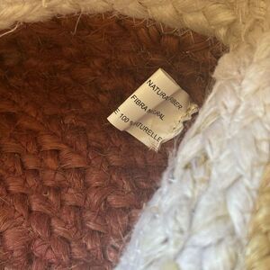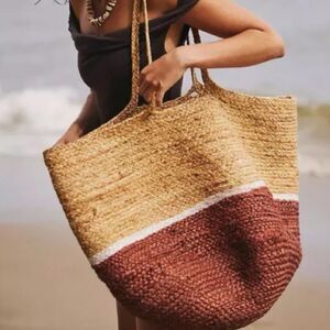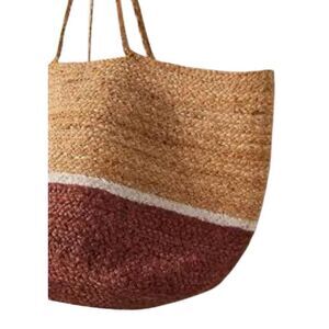 This oversized tote bag is made from woven jute with a color-blocked design, featuring a natural tone on top and a reddish-brown on the bottom, separated by a white stripe.