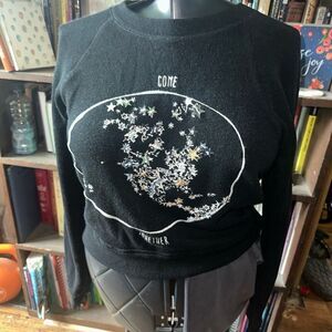 Free People Come Together, sequin star, North America map, black, cropped sweatshirt. Pairs well with leggings or shorts. Approximately 19 inches from armpit to armpit, 20.5 inches long. In good, used condition. From a pet and smoke free house.