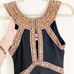 Free People Nefertiti Black Body Con Dress XS EUC. Black textured poly/viscose/spandex blend body with brown mirror accented embellishments that define your shape and intrigue the eye. Side-zipper. Dramatic keyhole closure in back. Wear this Free People Nefertiti black body con dress XS only if you want to look amazing. Body con. Please see photos for additional details. Pit to Pit 15“ Waist 26“ Length 32“
