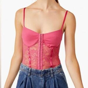 Free People pink sheer sweetheart neck lace faux corset bodysuit.