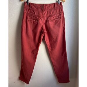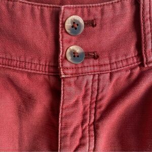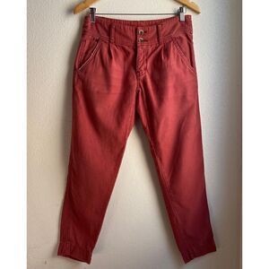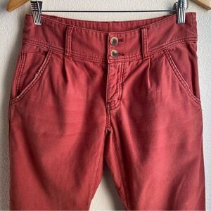 Features: Low rise, button fly, pleated front, tapered style, washed red color, distressed details, 100% cotton
