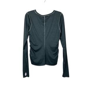 Features: Soft, smooth fabrication; thumb holes; seam stitching details at shoulder and body; ruching at side seams for flattering silhouette;