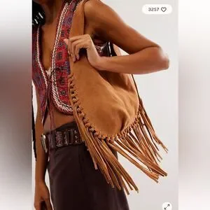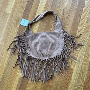 Add a fun touch to any ‘fit with this super cool bag featured in a soft suede fabrication with exaggerated fringe detailing at trim for dimension.