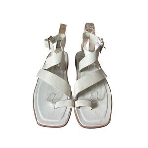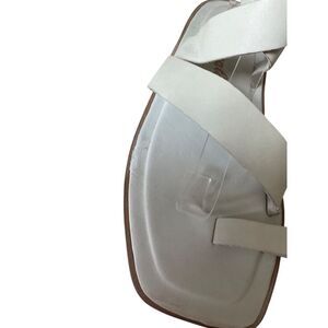 Features: Flat style, wrap design, squared-off open toe, thick straps, toe strap, adjustable ankle strap, chunky buckle closure