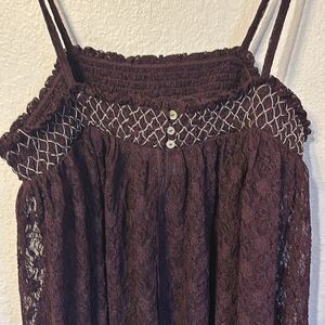 Plum lace romper from Free People. Square neckline with adjustable tie straps. Size large.