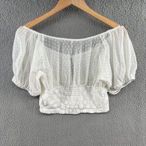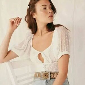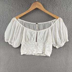 Free People Sheer Puff Sleeve Button Front Crop Top Ivory Lace XS OB1167439