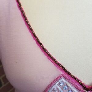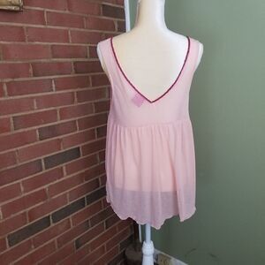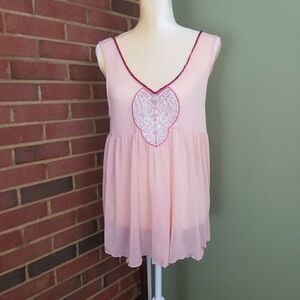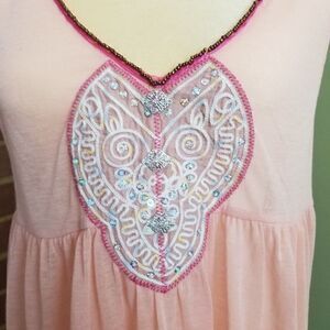 Free People sheer sleeveless blouse in a flowy pale pink. V-neck and V in back surrounded with beading. On decolletage is gorgeous embroidery with sequins. NWOT SZ L fits like MED. A-29. A2924