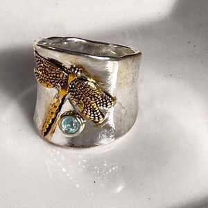 Bold silver ring with a gold dragonfly design. Features a striking blue gemstone accent.