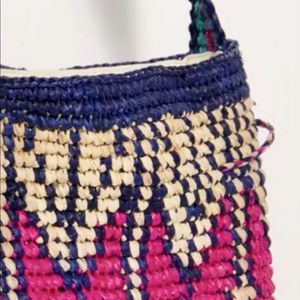 Free People Straw Tote Bucket Messenger Bag Pink Blue Drawstring Tassel