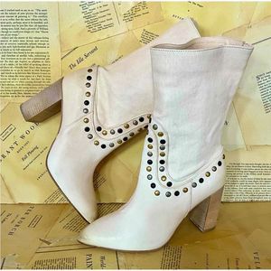 Free People Studded Dakota Heel Boot Leather Slouch Ivory Distressed Leather