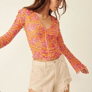 Embrace a vibrant style in this pink and orange, v-neck floral blouse by Free People with long, ruched sleeves. Featuring hook and eye closure. 100% cotton. L 24 x W 19” pit to pit. NWT.