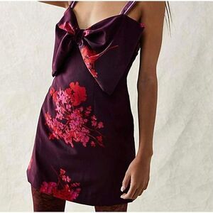 Turn heads in this forever timeless mini dress featured in a staple, A-line silhouette with floral printing throughout and exaggerated bow at front for added dimension. *Fit:* Classic, A-line fit *Features:* Silky fabrication, contrast velvet shoulder straps, smocking at back