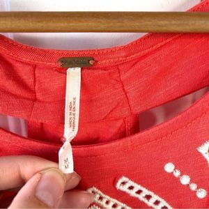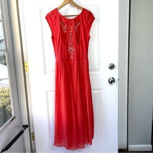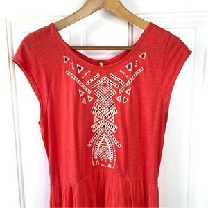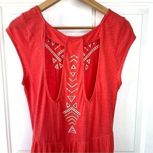 Free People “Toosaloosa Slub Meadows” midi dress in ‘Cactus Flo’ coral orange color. Embroidered geometric cutout design on front and back.