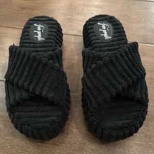 Features: Slip-on style, thick ribbed terry fabrication,chunky criss-cross toe strap, slight platform sole, lined footbed