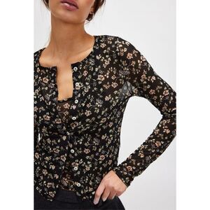 Features: Floral print mesh fabrication, fitted tank, scoop-neckline, button closures