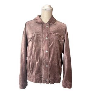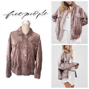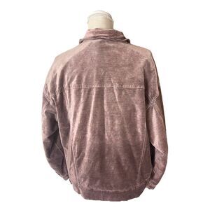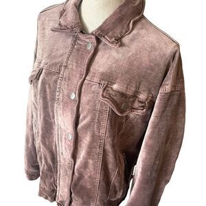 Free People Velvet Finish Trucker Jacket in Dusty Mauve. Features a gorgeous dusty mauve in velvet finish. The light reflects off of it to give a variety of hues from deep to light, giving off an ombré effect. Very well made; heavier weight with a slightly vintage/distressed look. Front zipper and snap button closures. Front flap pockets with snap button closures. Side zipper pockets. Snap button sleeves. Velvet/Velour finish. Exterior: 62% cotton, 36% rayon, 2% spandex. Lining: 100% cotton. Measurements in pictures. Please note: this is very oversized and fits more like a medium.