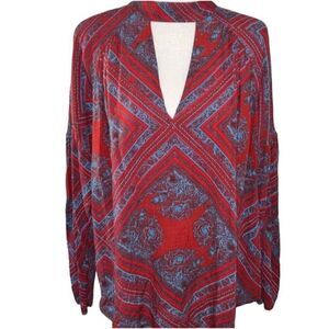 This Free People Walking on a Dream Red Tunic Top is a dreamy addition to any wardrobe. The XS size top features a plunging V-neck choker neckline, long sleeves, a flowy boho style, and a high-low hemline. It's made from comfortable rayon and is in excellent used condition. See measurements in photos. Fir is oversized.