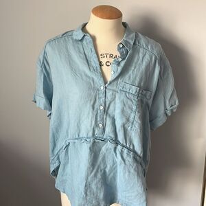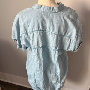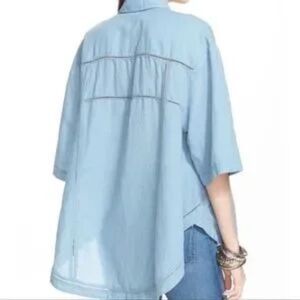 This blue oversized button down shirt features a unique sailor collar and a boxy, relaxed fit. Its lightweight fabric and roomy design make it perfect for a casual, comfortable look.
