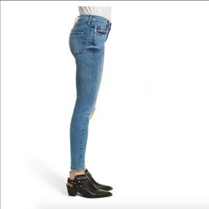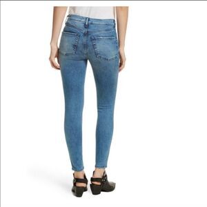 Free People busted knee high waist jeans size 29. Excellent condition with factory distressing. Comfortable high rise with stretch. See photos for measurements and fabric content