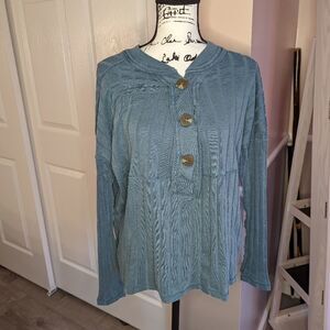 Free People in the mix top. 3 button, kind of roomy. Sleeves are fitted.
