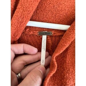 Free People, orange color cowl neck sweater, oversized BoHo style, cotton polyester acrylic blend, some pilling but not very noticeable, one pull near top left shoulder, barely noticeable when wearing, pit to pit 17.5 inches, shoulder to bottom 24.5 inches, sleeve length 20 inches, Super soft and warm, has that typical free people seam showing, inside out look.