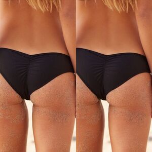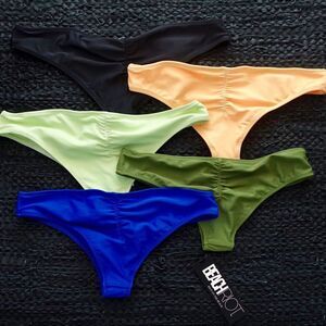 Solid low rise bikini bottoms in a cheeky fit with ruched detailing in back. American made.