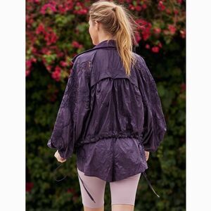 Form running marathons to running errands, this pretty warm-up style nylon jacket featured flared sleeves and eyelet floral embroidery. With a zip-up front and ribbed accents, this jacket is the perfect workout layer.