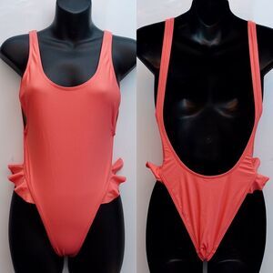 Classic high cut one-piece swimsuit featuring ruffle detailing on the sides.