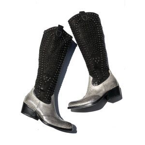 Crafted in Italy, these luxe tall leather boots are featured in a western-inspired style with studded details and a textured croc accents.