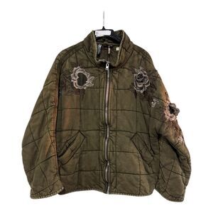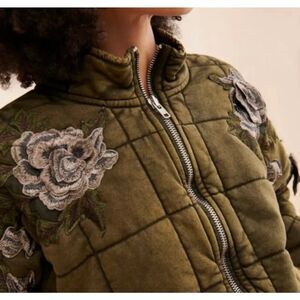 Free People X Tricia Fix Quilted Dolman Jacket with Upcycled Embellished Rose Bomber in Olive Green, Size Small.